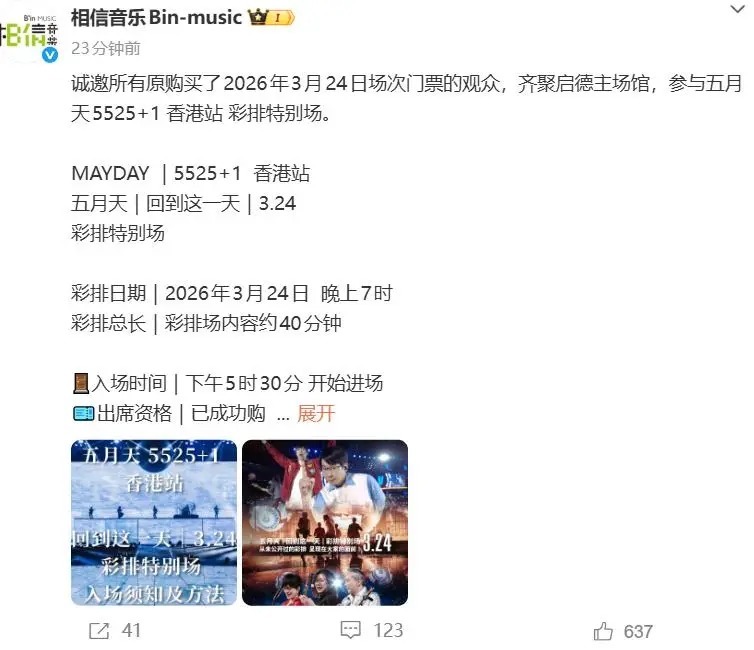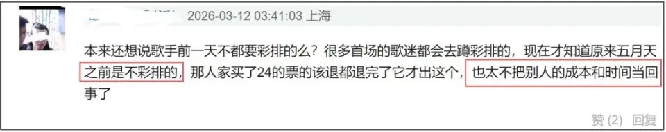 而五月天方最终给出的解决方案,是在24号又补了一场——但划重点,加的这一场只有40分钟,还是彩排,相当于用这40分钟彩排抵消了机酒补偿。