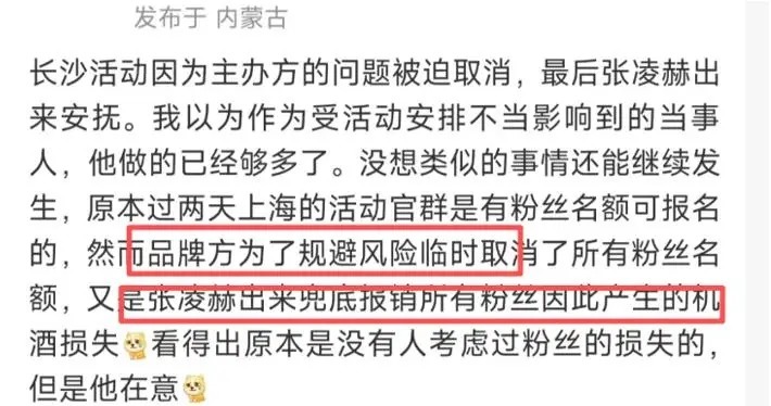 活动不是因为他的原因取消的,但最后是他这一方,而非品牌方承担了粉丝的补偿,这一点反而很拉网友好感。